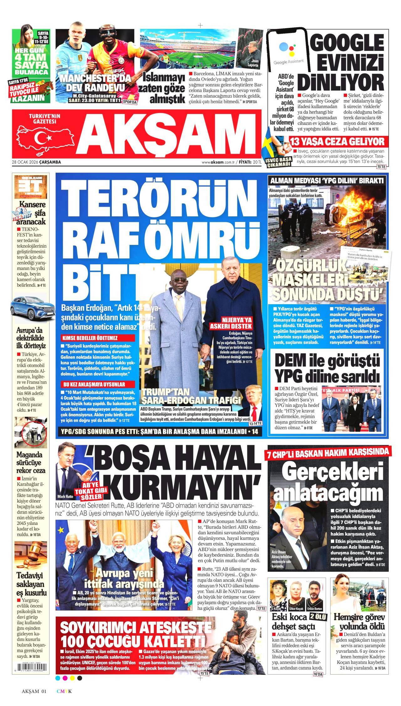 28 Ocak 2026 Çarşamba tarihli Akşam Gazetesi manşeti