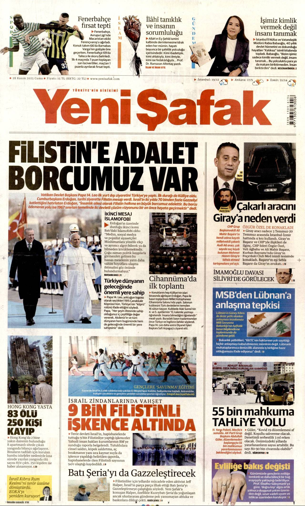 29 Kasım 2025 Cumartesi tarihli Yeni Şafak Gazetesi manşeti